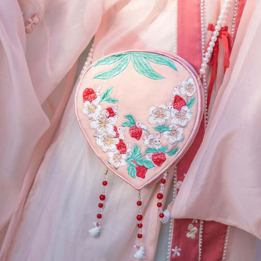Pink Vintage Hanfu Embroidery Bag Strawberry Handmade Shoulder Crossbody Bag Cellphone Bag Round Handbag